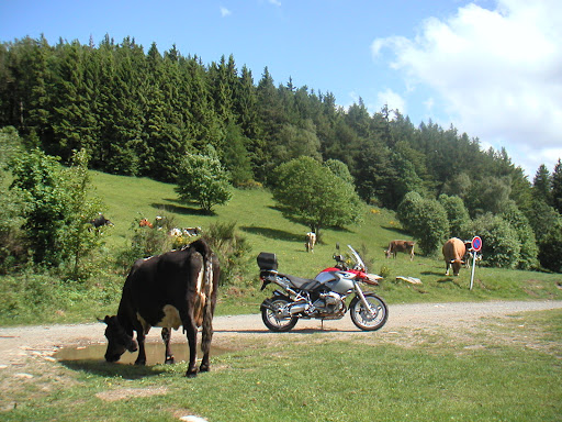 La plaine et l'autoroute en tupperware , j'y passe calmos presque à la vitesse prescrite .Question de discipline ... parce que la poignée de gaz , c'est vous qui la tournez aux dernières nouvelles . Aucune moto ne rend optimiste ,chacune à ses qualités intrinsèques il suffit de rester dans les limites de chaque véhicule et de garder la tête froide quoiqu'il arrive que ce soit sur GS ou autre ou en Ural qui n'ont qu'un point commun ...vous .